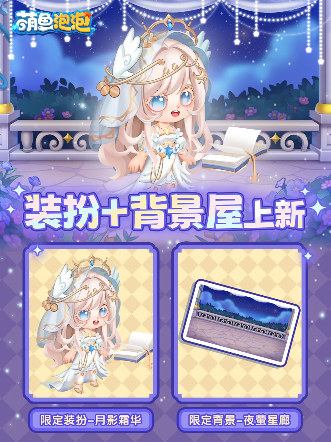 置身于「夜萤星廊」梦幻之境身披「月影霜华」流光舞裙,周身荧光环绕,✨裙摆自带星月特效,偶像剧女主光环直接拉满!⏰10月27日全新套装和背景同步登场跟着泡泡一同来欣赏欣赏~