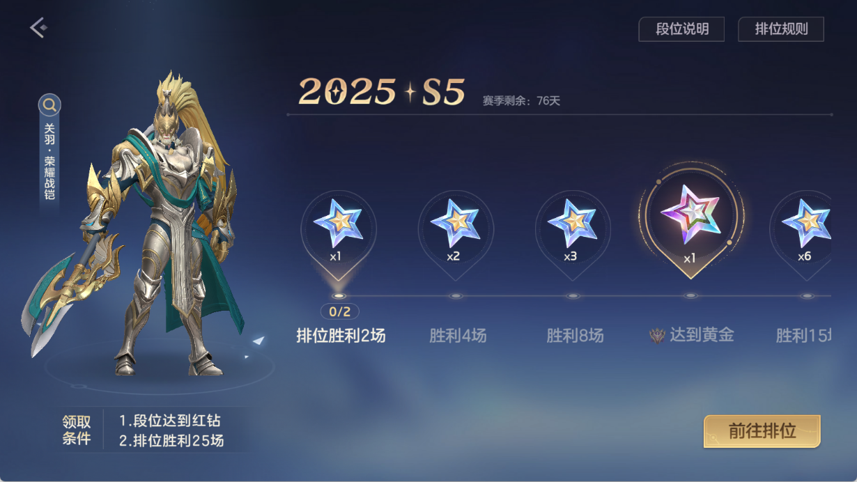 新赛季排位胜利25场并达到红钻,即可免费领取关羽新皮肤【荣耀战铠】