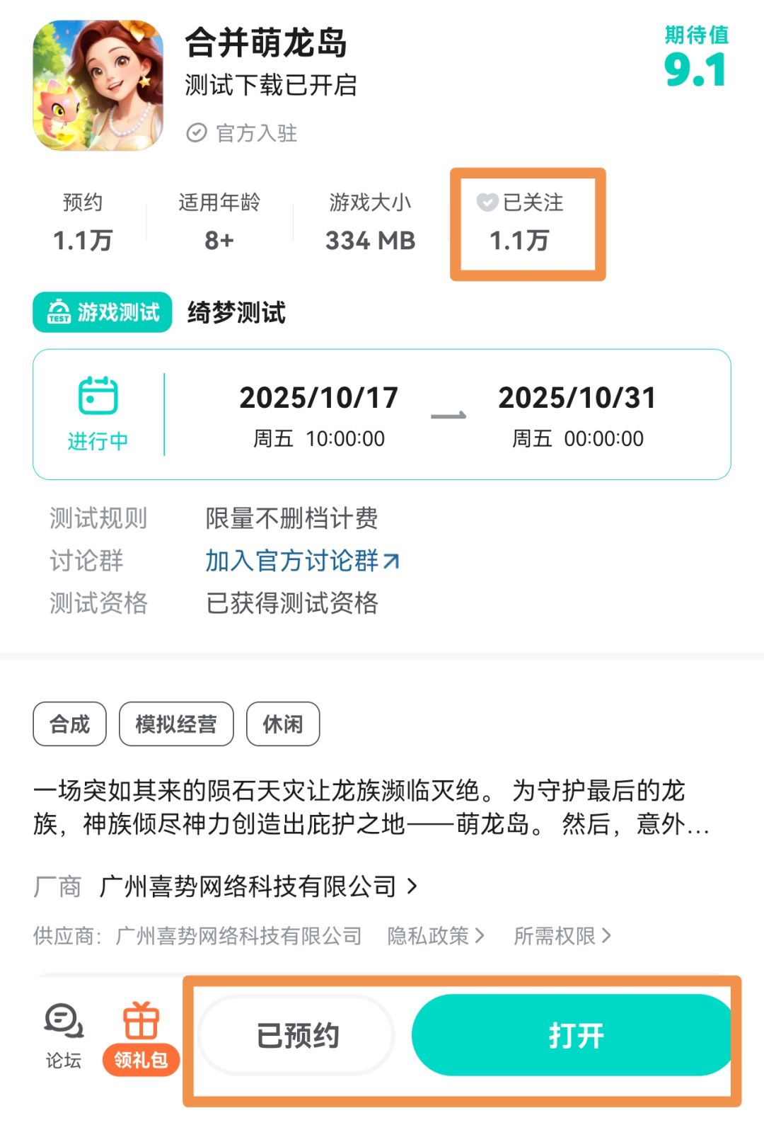 1️⃣活动期间在TapTap关注、并参与《合并萌龙岛》绮梦测试,下载并进入游戏体验;