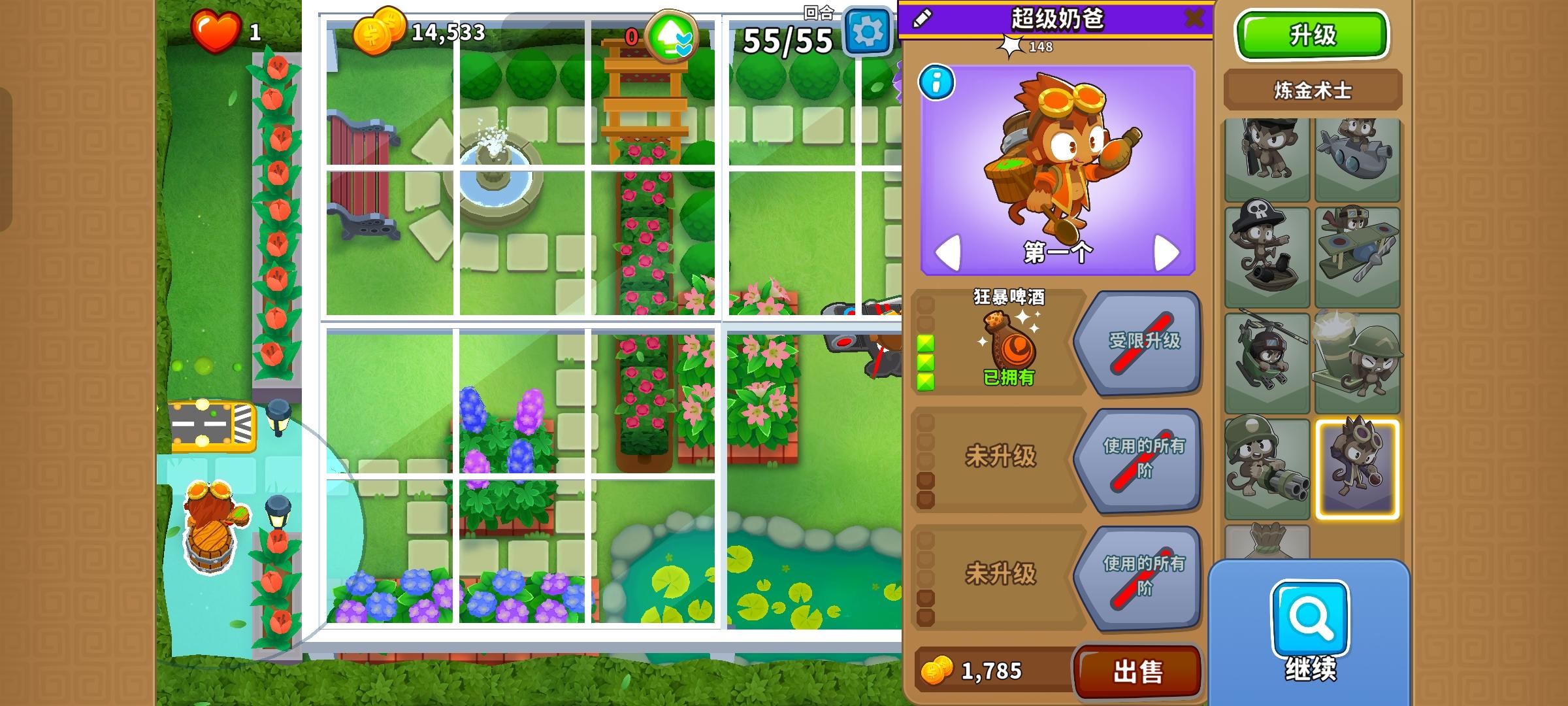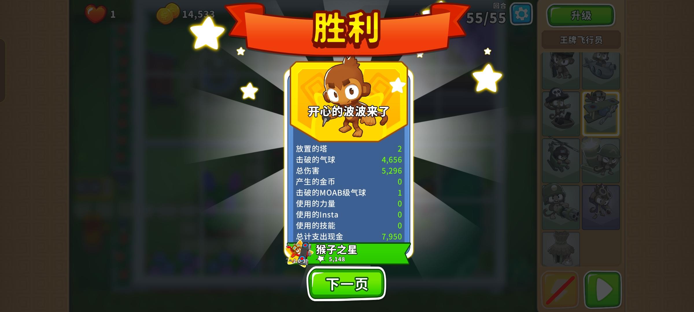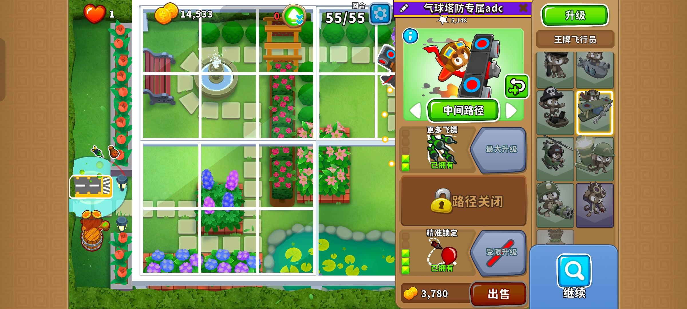 在窗户外面放下240迫击炮猴,配上200猴子村辅助,将目标锁在路径拐弯的地方,有漏掉的气球就更改迫击炮的目标,等到MOAB来时就放技能轻松通过。