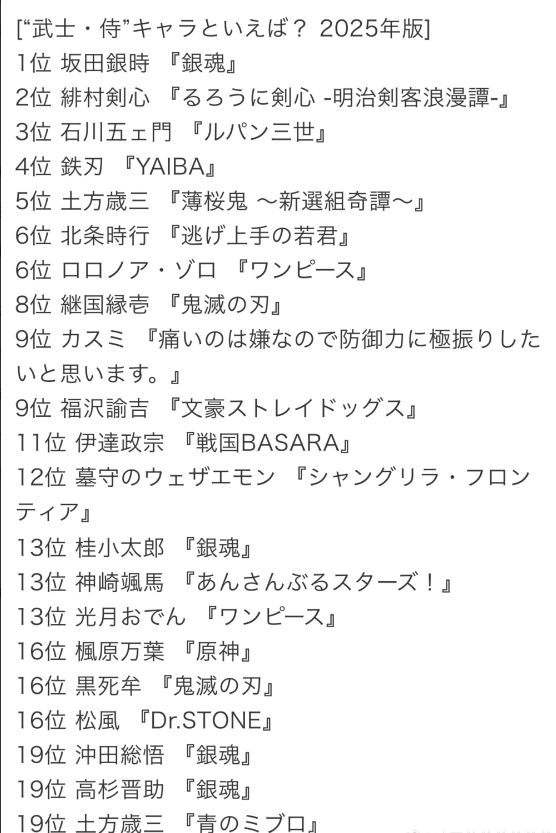 日网票选TOP20🔥「最喜爱的二次元武士榜」