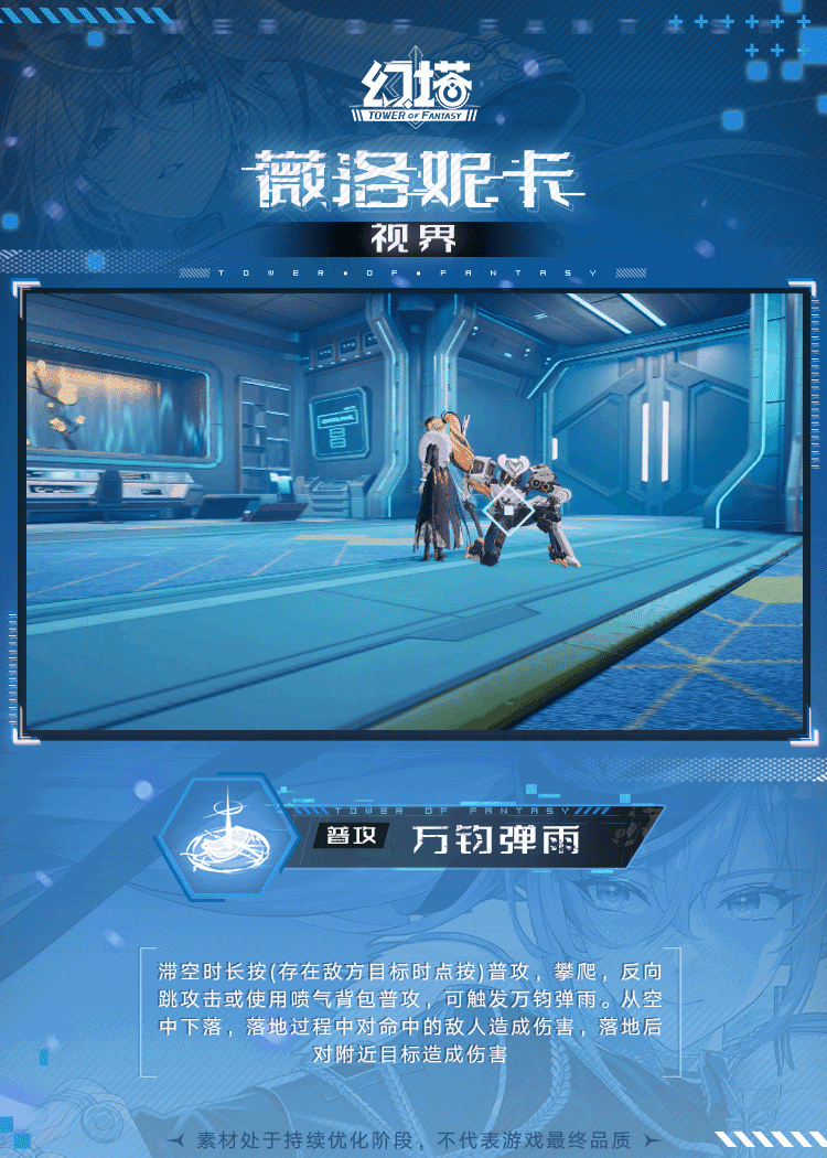 滞空时长按(存在敌方目标时点按)普攻,攀爬,反向跳攻击或使用喷气背包普攻,可触发万钧弹雨。从空中下落,落地过程中对命中的敌人造成伤害,落地后对附近目标造成伤害
