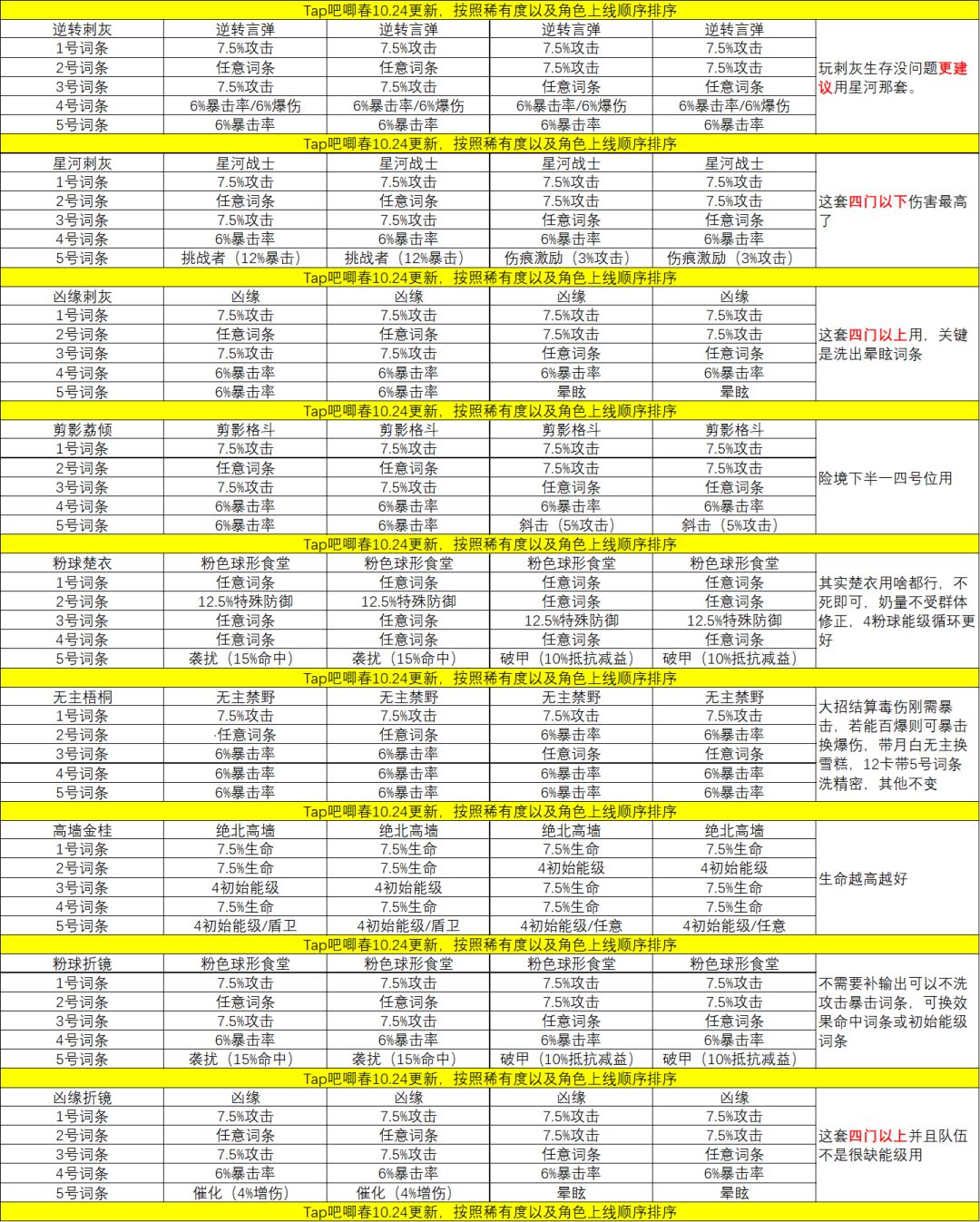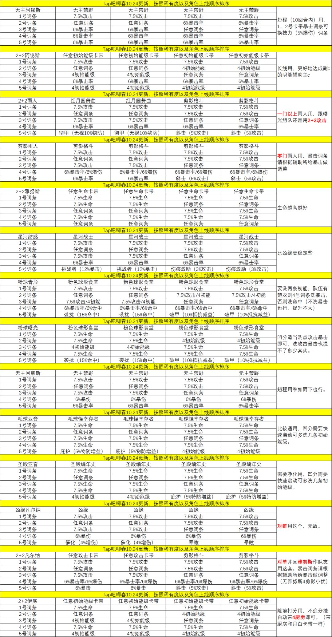 - 亚音池(10.9~11.6):普攻队专辅(攻击力、暴击率、普攻增伤、穿甲、生存辅),投资普攻队必抽(关键门阶一门,没一门能级循环问题很大。建议平民非xp党等等周年限定定位再选择抽取)。