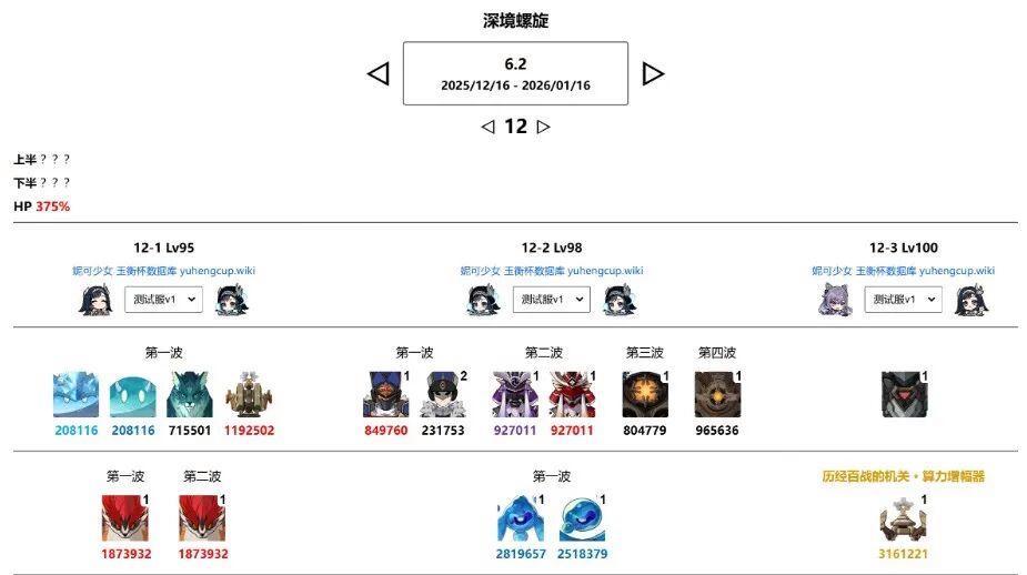 而下半则是把纳塔的那一只狐狸终于端到老深渊来了,本来还以为他只会在真境剧诗里面出现,而现在也是第一次进入到老深渊当中如果我没记错的话,并且它是分两波出现,整体难度还行,只需要用下落攻击去应对就好了。第二间的话是一个水免的环境,所以龙王肯定打不了这一关,龙王还是去上半会更合适,至于上半的水免怪物带一个后台火系或者雷系角色去清除掉就可以了。12-3的下半同样也是一个利好于下落攻击角色的大世界boss,难度也不高,所以按照这个怪物分布,果子这边给到的卡池安排推测如下。