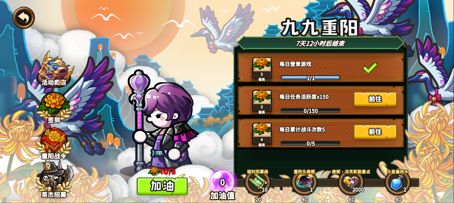 ●重阳节活动开启! 完成每日登录、战斗等任务收集菊英道具,消耗菊英加油积累进度值,达到指定额度即可领取丰富奖励!
