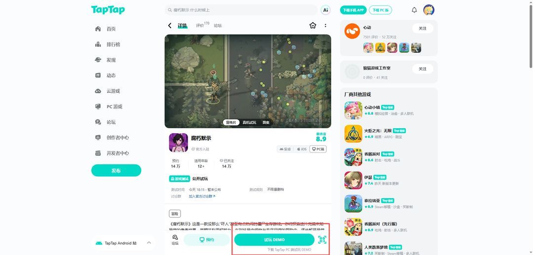 最后也和大家分享一下,我们的DEMO今天也在TAPPC可供下载了,日常因为网络使用STEAM不方便的话,也可以在TAPPC上面体验一下DEMO,也支持双人局域网联机。大家可以点击下方链接进入TAP商店页,点击【试玩DEMO】按钮就能下载试玩啦!