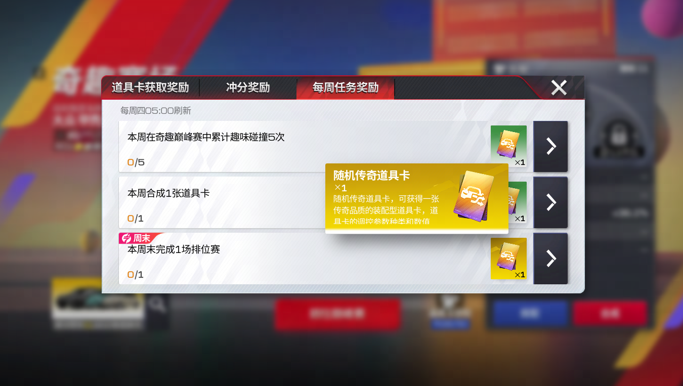 周末完成奇趣赛场专属任务,必得1张传奇道具卡!没错,就是最高品质的道具卡!装配后甩对手一条街,美美冲分赢大奖!
