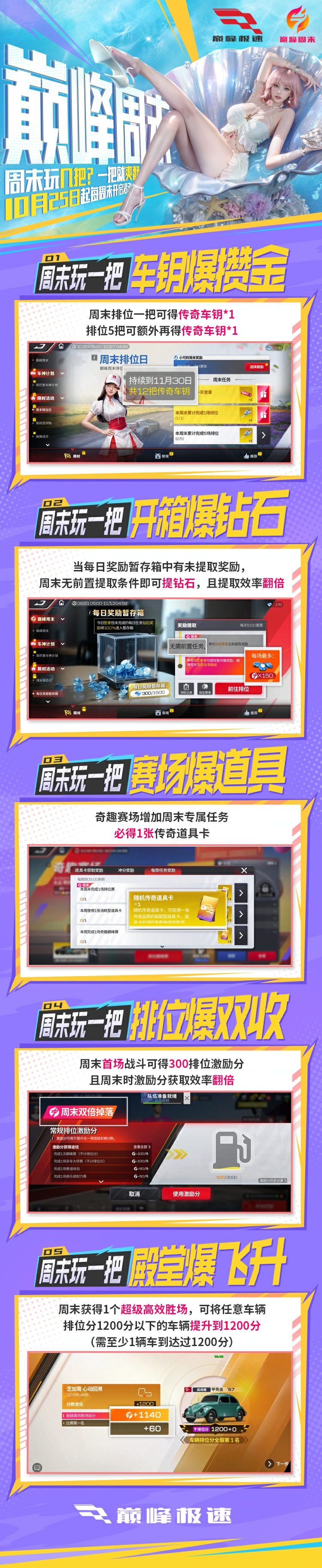 周末不上线,福利少一半;周末玩一把,奖励翻倍赚!这份《玩转巅峰周末秘籍》的精髓,小可都为你浓缩在下面的长图里了!车手们速速码住,明天上线照着玩就对了!