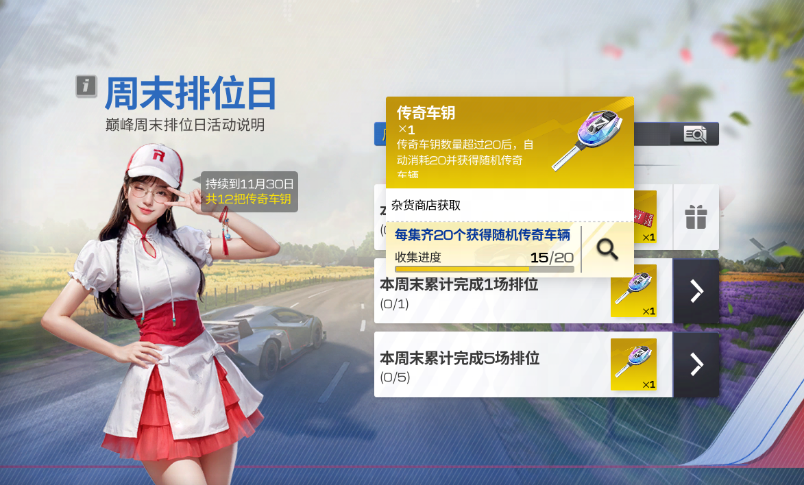 ✅传奇车钥×2:周末累计完成1场排位得一把传奇车钥,累计完成5场排位再得一把传奇车钥,持续到11月30日共计6个周末,只要坚持上线,就能稳稳拿到12把传奇车钥!