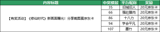 感谢各位仙友积极参与!让我们恭喜以下仙友获得本次活动奖励!结果公示如下:
