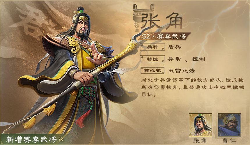 ● 【张角】的定位为异常控制,技能有高概率缴械,可与诸葛亮等武将组成控制或异常队来克制普攻队。