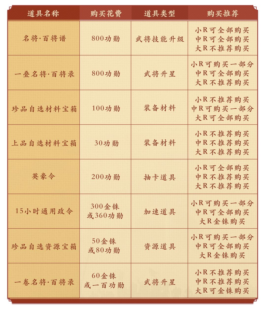 阿武提示:预算充足的玩家优先选择金铢购买加速道具、资源和百将录。否则可考虑优先用功勋购买资源以及英豪令哦。