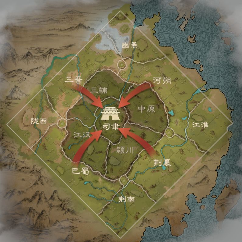 ● 二级资源州:江汉、颍川、中原、三辅。二级州拥有更丰富的资源和更高级的城池,每个出生州对应一个资源州。