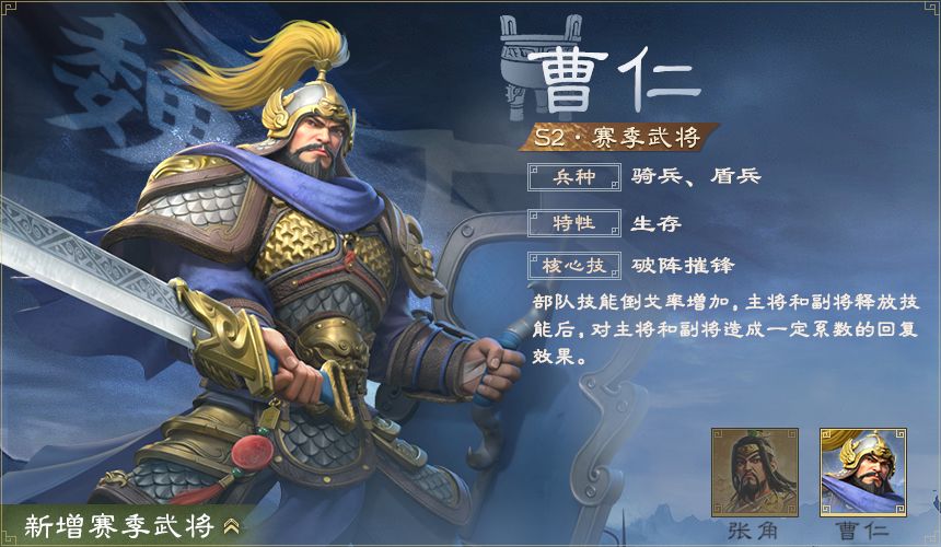 二赛季中有曹仁,张角两名新武将加入战场,各位主公需存储金铢抽取新武将。