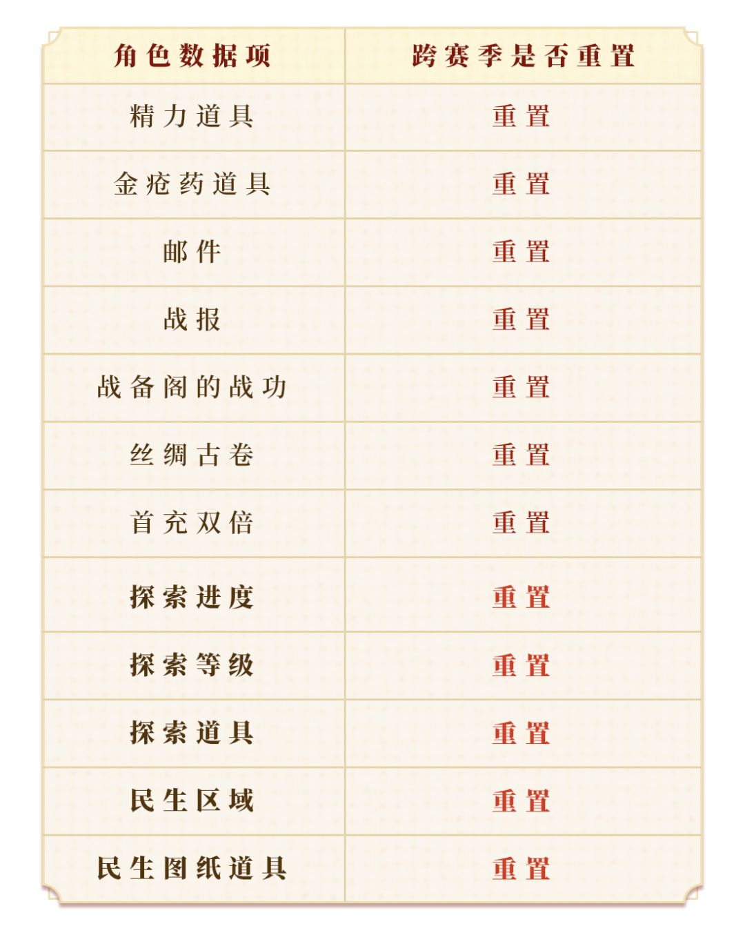 ● 一赛季的大部分内容都将保留,仅有民生,探索系统等少量内容会进行重置,下图为会进行重置的数据项,其他都会进行保留;