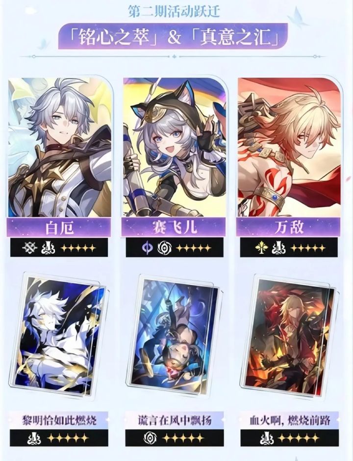 具体卡池信息为上半卡池昔涟up,遐蝶、风堇、缇宝三位限五角色同步复刻,其中遐蝶与风堇为当前版本强势角色,适合补强阵容,下半为复刻卡池白厄、赛飞儿、万敌加入卡池,黄金裔角色大甩卖了属于是![[TapTap表情|TapFamilyxdoro2_粉狗发射]](https://img-tc.tapimg.com/market/images/934f58613a089b2e214eb0e0638bbbad.gif)