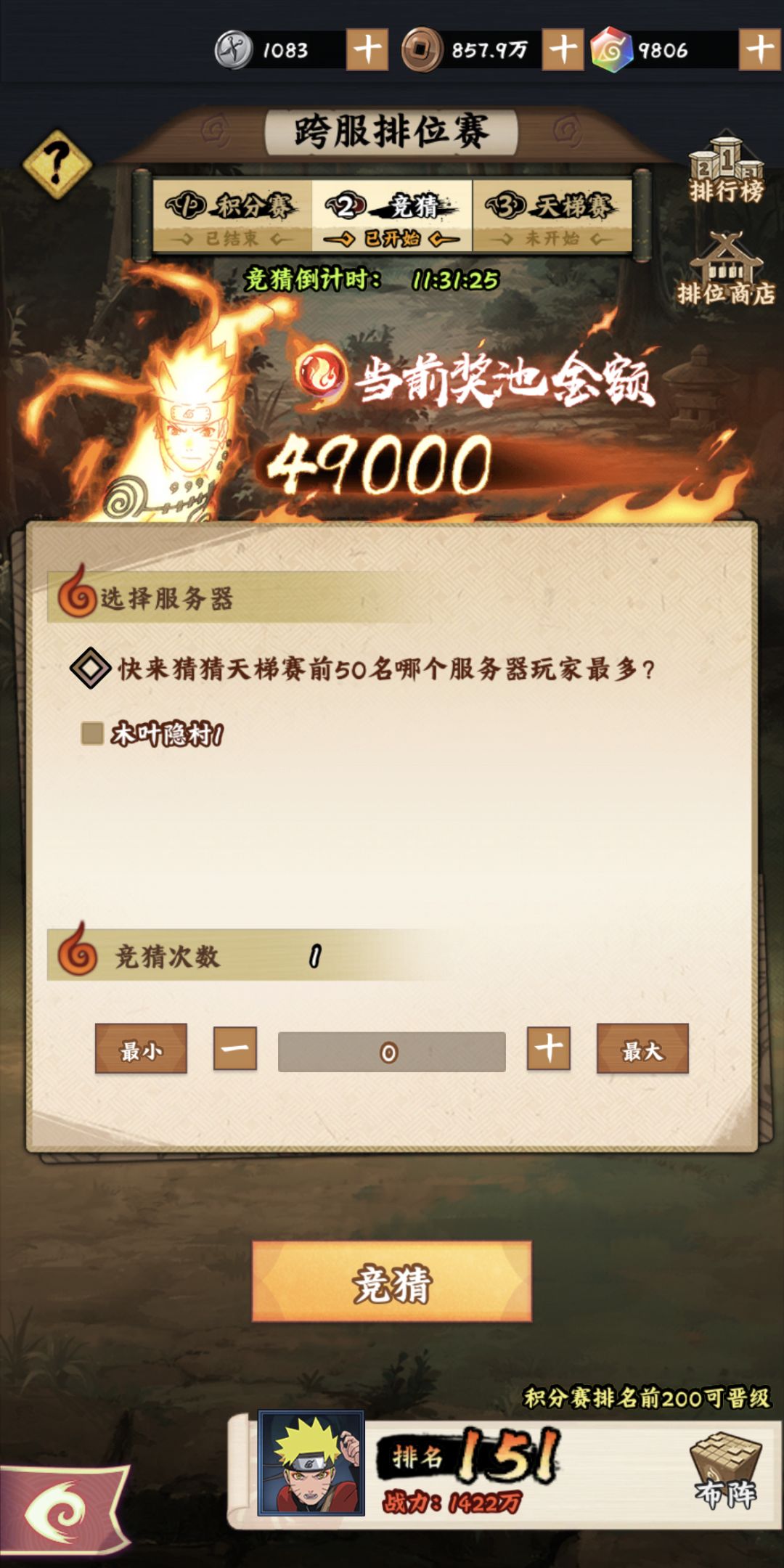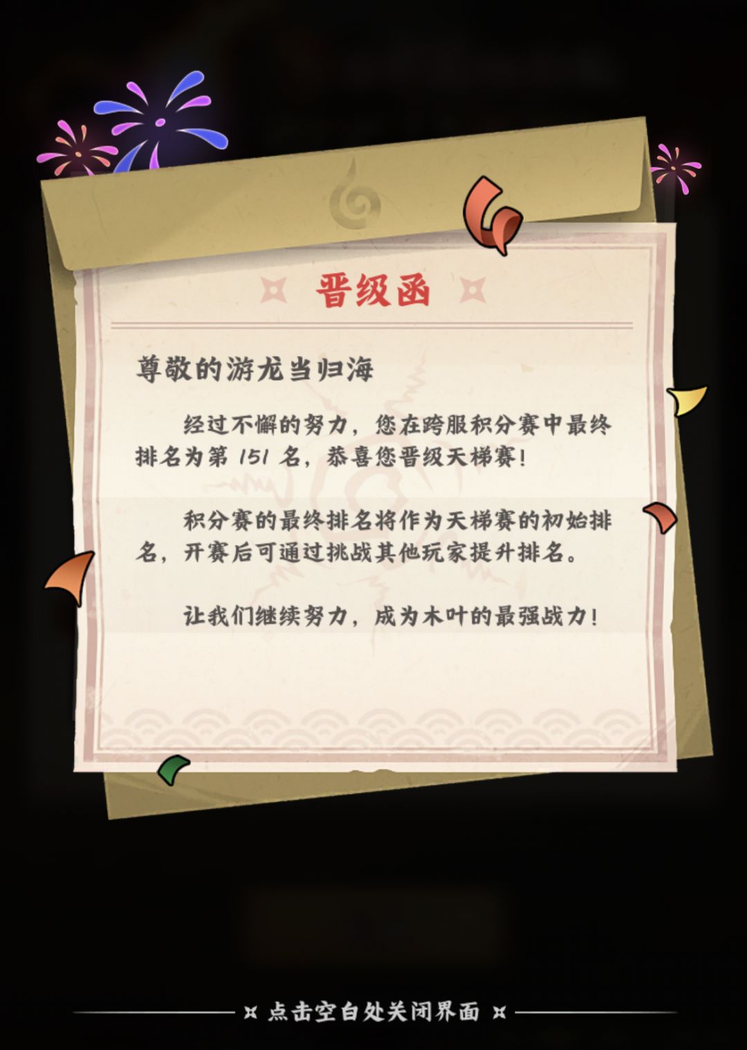 还有个好玩的事。竞猜天梯赛排名哪个区更靠前,合服前还有木叶隐村1-6供选择,现在只有木叶隐村1了,玩家没得选;同理,天梯赛要选合服以后前200名,如果玩家不够了,系统也没得选。这不,合服之后我都已经看不到自己的战力排行了,但这次竟然以第151名晋级了……