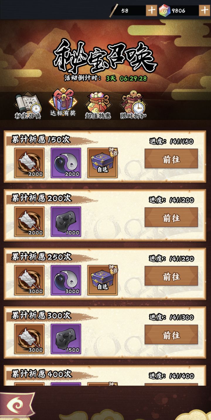 秘宝召唤的祈愿奖励分为多档,100抽以内每50次奖励1000觉醒材料,101-200抽每50抽奖励2000觉醒材料,201-300抽每50抽奖励3000觉醒材料,再往上的档位不适用零氪。对比之下300档最划算,消耗最少的祈愿签拿最多的觉醒材料。