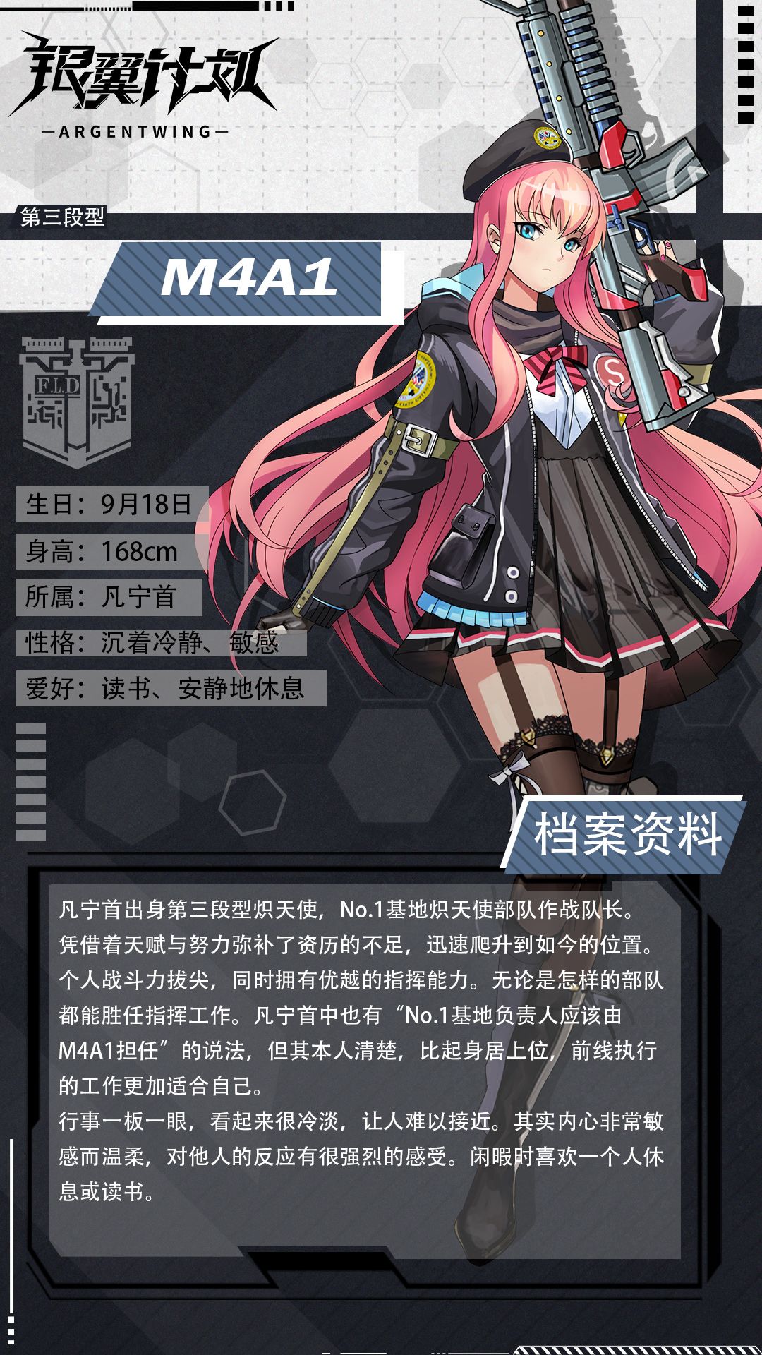 M4 A1在凡宁首任职期间多次挫败了远星的阴谋。在不善言谈的外表下,却有着冷静透彻的判断力。