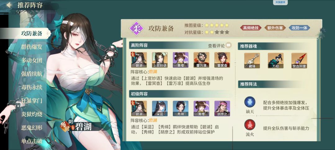 碧湖队开启游戏,因为系统送,碧湖和上官很好获取,雷万凛在初期也是一名合格的肉盾。优点是获取容易,不用专门抽取,不会浪费太多资源。