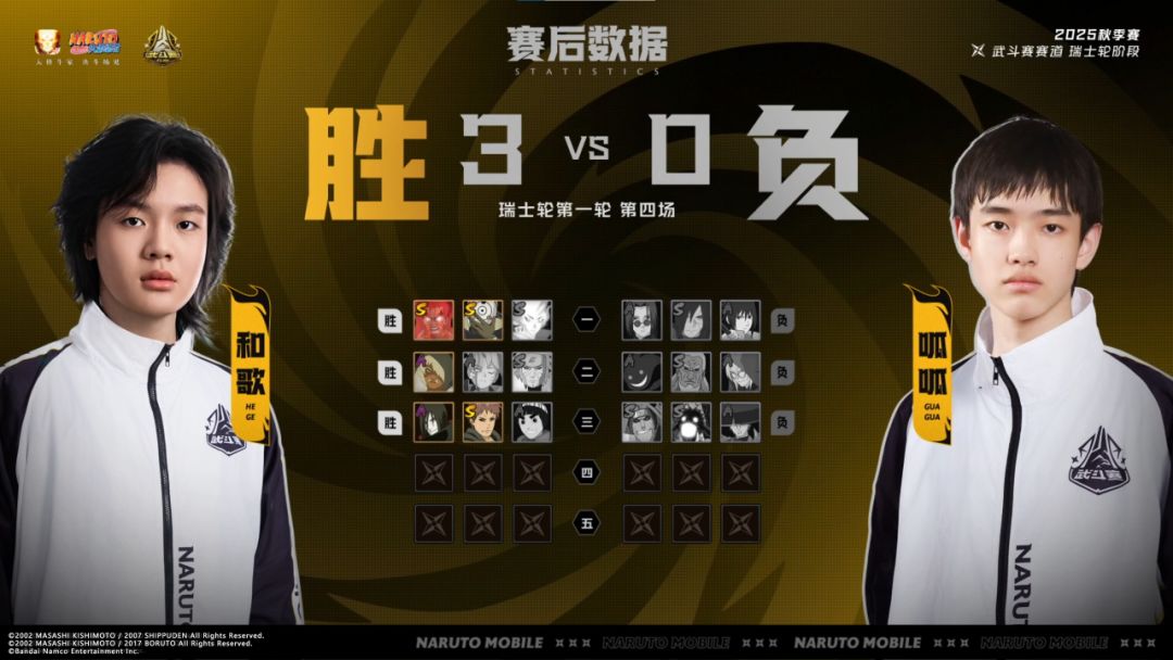 第一轮第4场和歌对战呱呱,第一局和歌的大筒木舍人「最终章」利用压场技能打出优势,拿下首局;第二局和歌凭借达鲁伊「五代目雷影」的技能优势和灵活走位获胜;第三局和歌继续火力全开,罗砂「四代目风影」多次技能先手,连续击败两名忍者,和歌3:0呱呱获得胜利!
