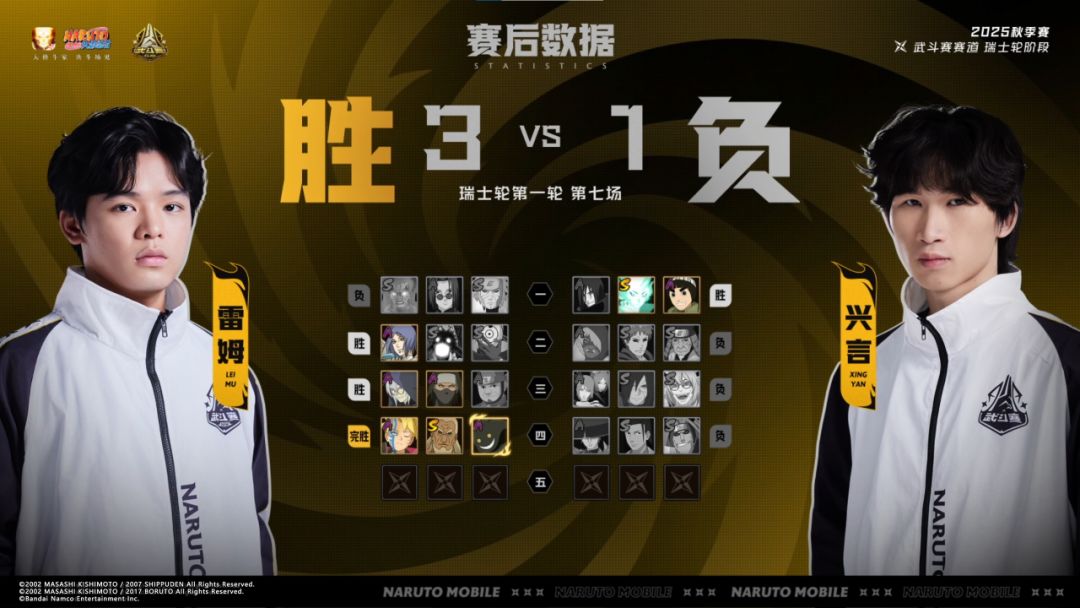 第一轮第7场雷姆对战兴言,兴言的大蛇丸「晓」将雷姆的保底忍者打至四豆血量,最后以微小的血量差险胜;第二局雷姆骗出兴言的替身后,释放通灵并开启奥义斩杀扳回一局;第三局雷姆越战越勇,黄土「忍界大战」发挥出色获胜;第四局雷姆使用黑绝附身艾「三代目雷影」搭配秘卷忍体术·御,让兴言无法招架,最终雷姆3:1兴言获胜!