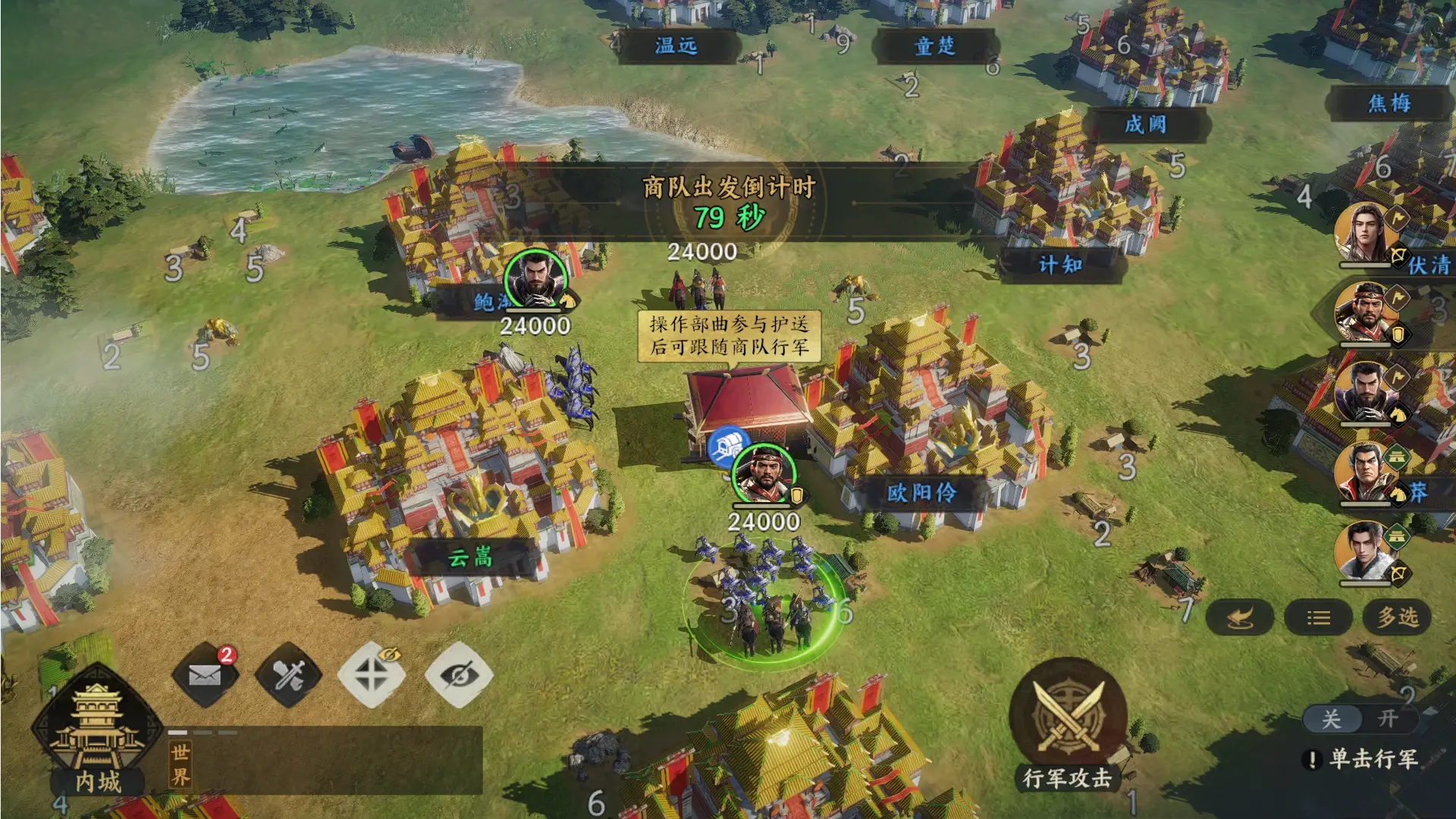 ●商队将在盟主主城附近生成,倒计时结束后自动出发,沿指定路线行向货栈终点。
