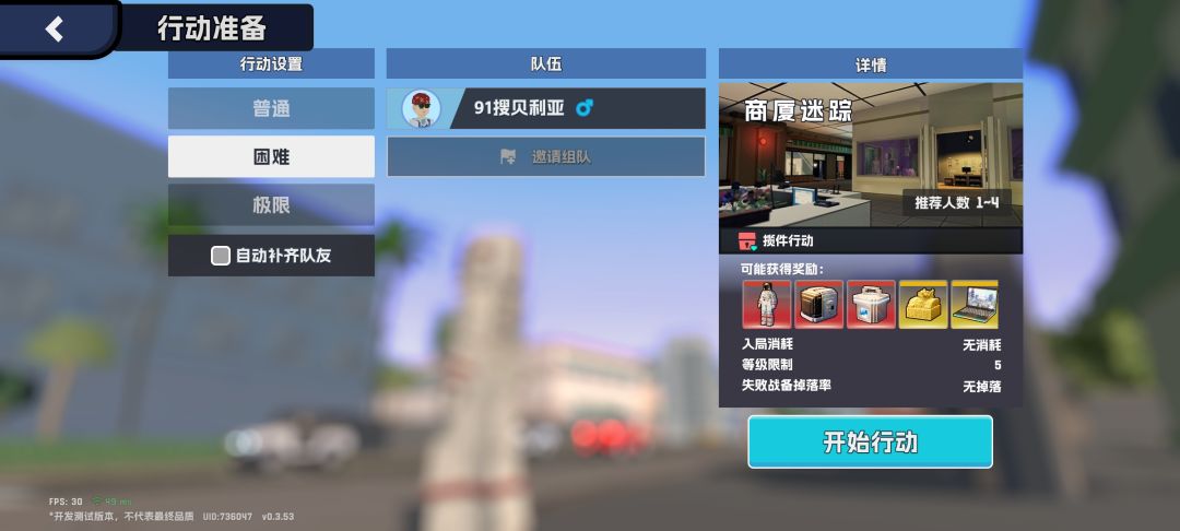 开始行动:可以选取难度(部分地图暂未开放困难,极限难度) 可以邀请他人组队,如果不想要匹配队友可以取消“自动补齐队友”,前方方框内无✔️号即取消成功