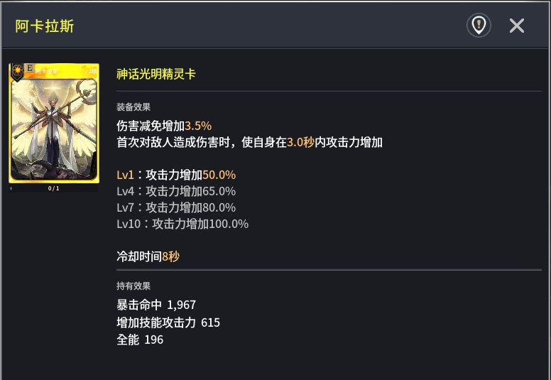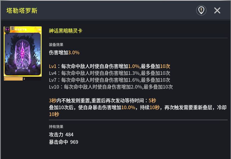 同样属于是对输出职业锦上添花的一张神话精灵卡,目前看来最契合的职业是拳套和普攻流大剑这样的高攻速职业,在连续命中敌人时伤害增加最多可以叠加10层且增加额外的暴击伤害,属于是输出职业的万金油卡,抽到的话建议直接装备上,增益效果非常显著。