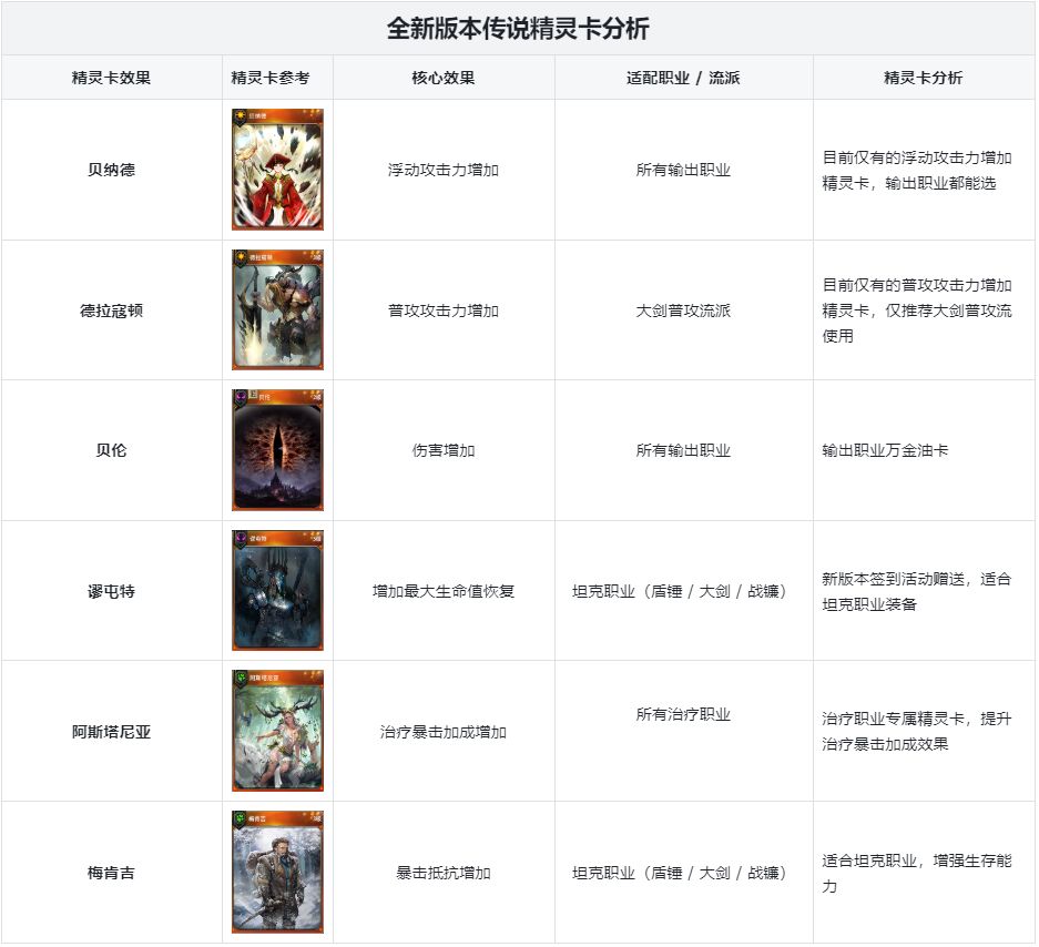 本次更新一共出了贝纳德、德拉寇顿、贝伦、谬屯特、阿斯塔尼亚、梅肯吉6张传说精灵卡,以下为每张新精灵卡的解析,以供各位参考: