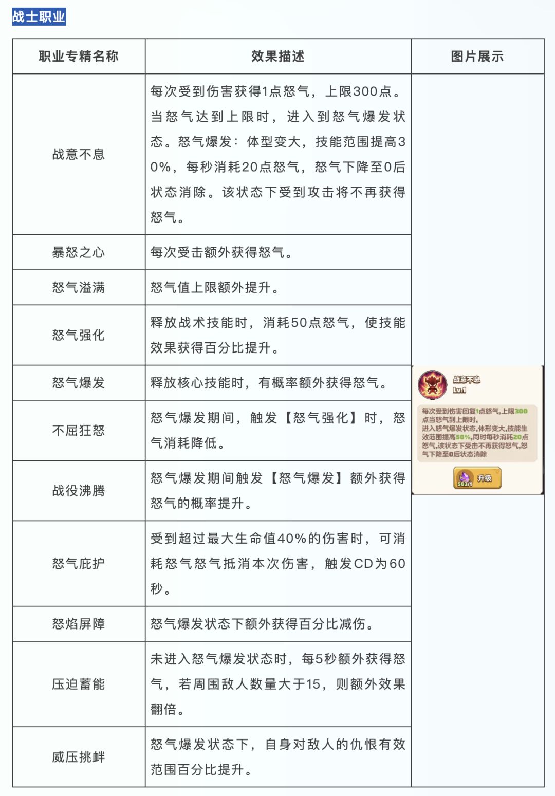 战士职业的专精效果主要围绕怒气,通过怒气可以获得技能范围增强、减伤等效果。