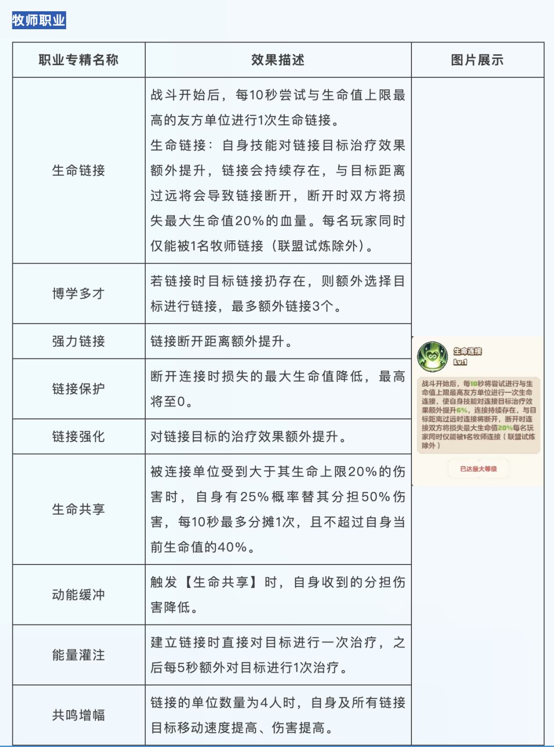 牧师的职业专精效果主要围绕生命共享,通过与队友建立生命链接,为其提供更高额的治疗以及移动速度、伤害等方面的加成。