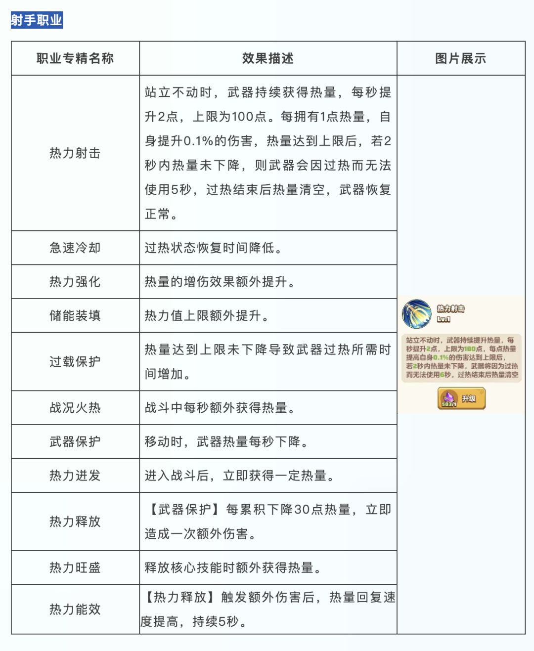 射手职业的专精效果主要围绕热力值,通过切换站立/移动状态,维持热力均衡,获得高额增伤。