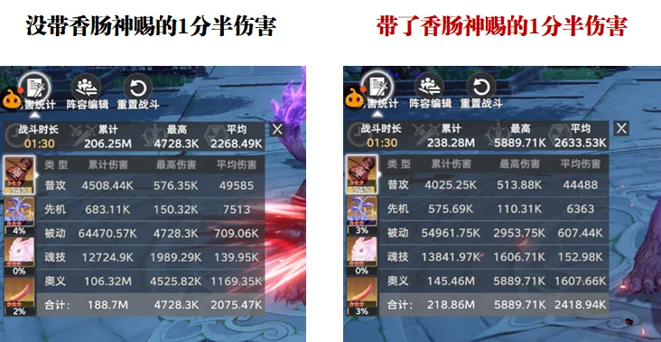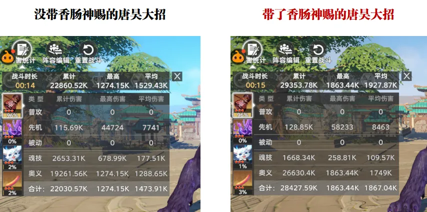 那么大家可以从上图中清晰的看到,的确在带上了奥斯卡神赐魂环后,唐昊的大招伤害也有了质变级别的提升,提升幅度则是接近于理论值的27%左右,所以这个神赐魂环的效果也是没啥问题的。不过大家需要注意的是,香肠的神赐魂环只能提升我方角色的奥义伤害,所以针对锤三、唐昊等主要以奥义伤害为输出核心的角色会有较大帮助,但反过来对于不怎么靠奥义的主C就比较一般了,这里给大家上几个实测的数据对比: