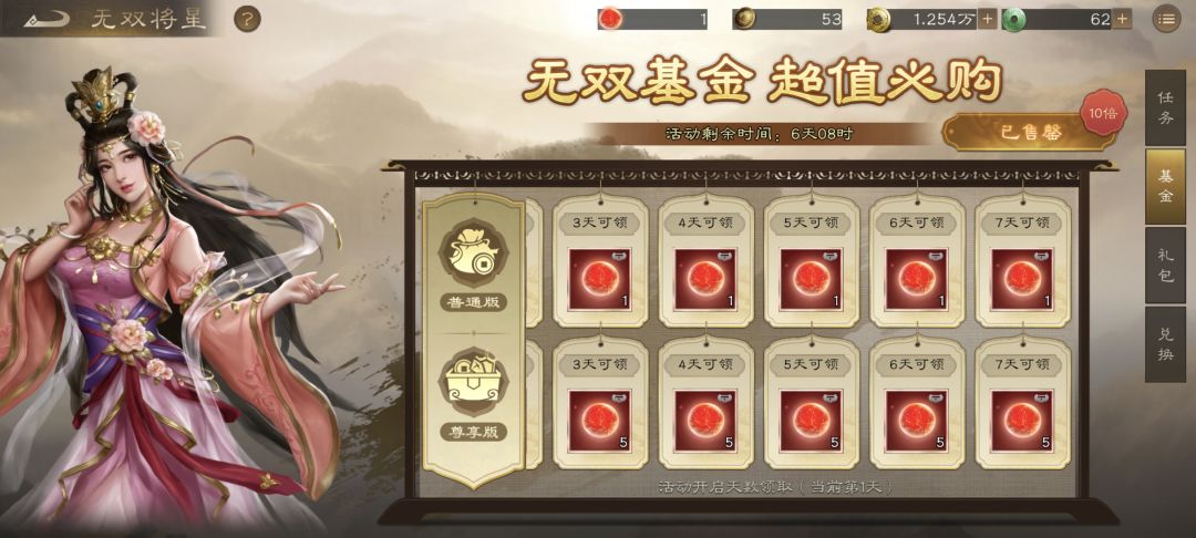 皇图活动,每半个月两次,其中第四层有10个无双抽,全部换完需要750皇图券,而零氪每次皇图活动(算上每半个月开箱活动)共可白嫖680皇图券,如果运气好挖宝和一些其他活动兑换了皇图券,那么每个月也可以通过皇图获得10抽,我这里按最小值算7抽