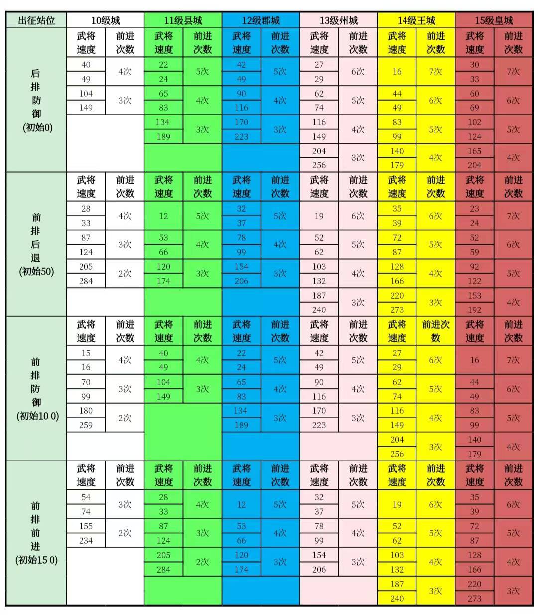 王城打法和打郡城州城打法一致,先用弓兵消耗近战,再用投石车打掉冲车,弩车,弓兵,最后用轻骑打投石车,这里只需根据群里的大佬留下来的图表,调整下投石车初始位置即可,我把大佬们总结的表放在最后一张图了,个人建议选择把速度在42-49这个档次,这个档次速度完美适用10级城到王城所有城市打法,而且只需要蓝色鞋子就能达到速度,对装备要求不高,不怕卡速不达标