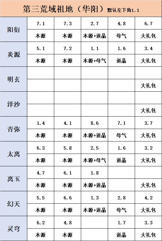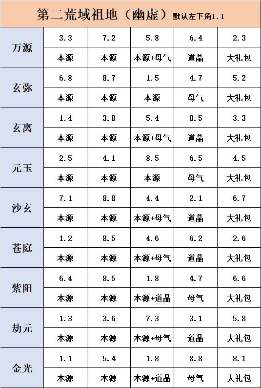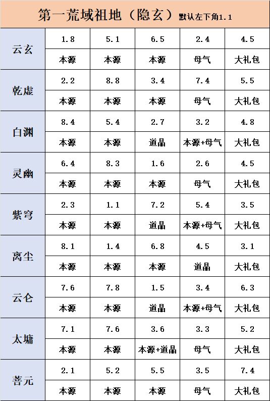注意:每个祖地都是三个本源+道晶+母气+大礼包的,有些祖地没有母气或者道晶就是和其中一个本源在一起,统计的时候有可能会忽略掉了,所以不要奇怪