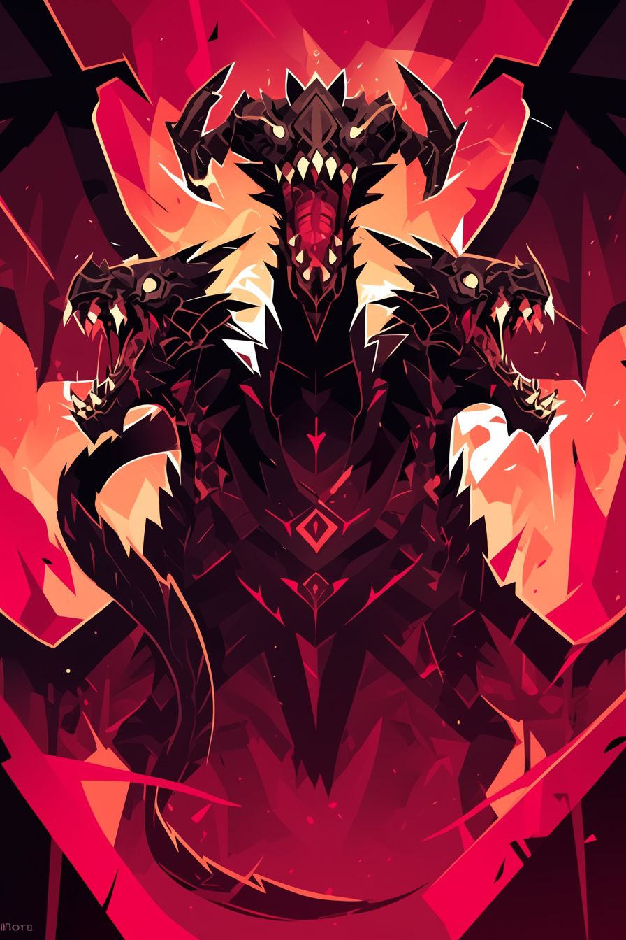 综合游戏的故事背景,目前卡牌的设计以七十二柱恶魔为主题。例如,下面图中的这张卡牌就是以七十二柱恶魔中的艾姆(Aim)为原型设计的(图三)传说中,艾姆拥有三颗头颅,分别是蛇头、前额有两颗咒文五芒星的人头、以及猫(或说小牛)的头。这位公爵以一条全身冒红烟的地狱大蛇为坐骑,右手持火玉,所到之处寸草不生。
