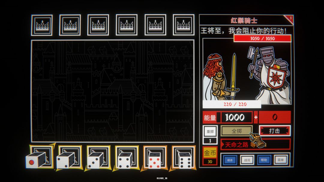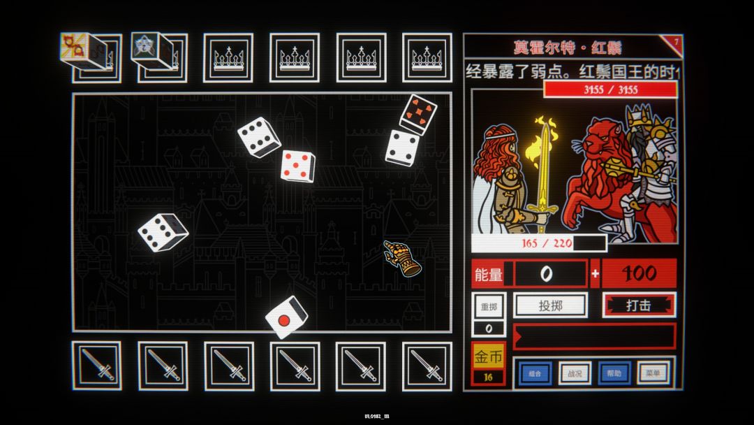 整个游戏的场景都很简单,电子音乐的鼓点与节奏声中,你能看到的是一个类似棋盘的界面,上下个六个方格,上面有着王冠图标,下方则是武器图标,中间是投掷骰子的区域,而在右边则是信息栏,上方有简单的角色形象,你能看到红色卷发身穿铠甲手拿王者之剑的角色,面对着右边的敌人。