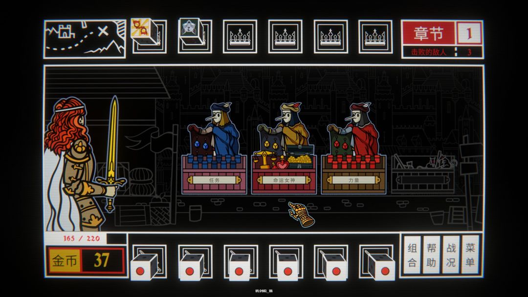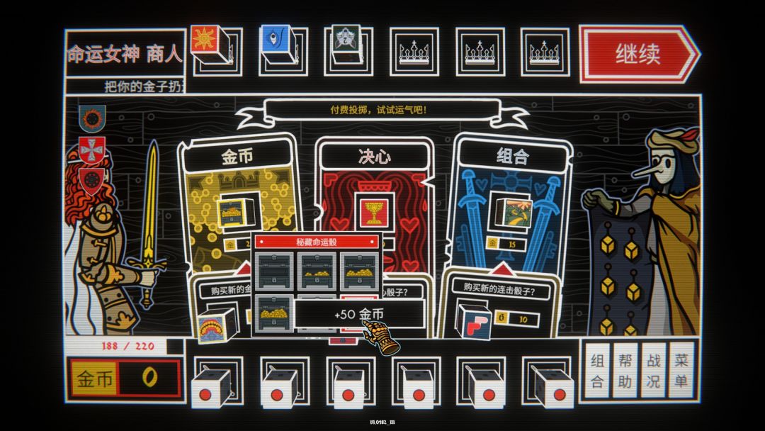 获胜之后你可以从两种奖励中选择一个,增加决心和金币或是只要金币,决心其实就是你的生命值,击败BOSS之外还有任务骰奖励,比如碎冠者任务骰,能加护甲或是掷出偶数获得能量等等,当然获得的金币可以在商人那里消费,进入商店时,你能看到随机出现的四位商人,因为时随机的,会在任务、联合、命运女神、附庸和力量等等中随机出现四个,选择一个就能进入购买不同的骰子。