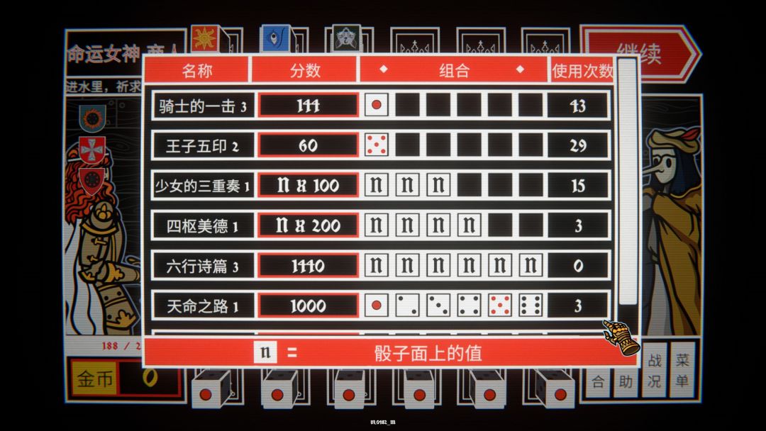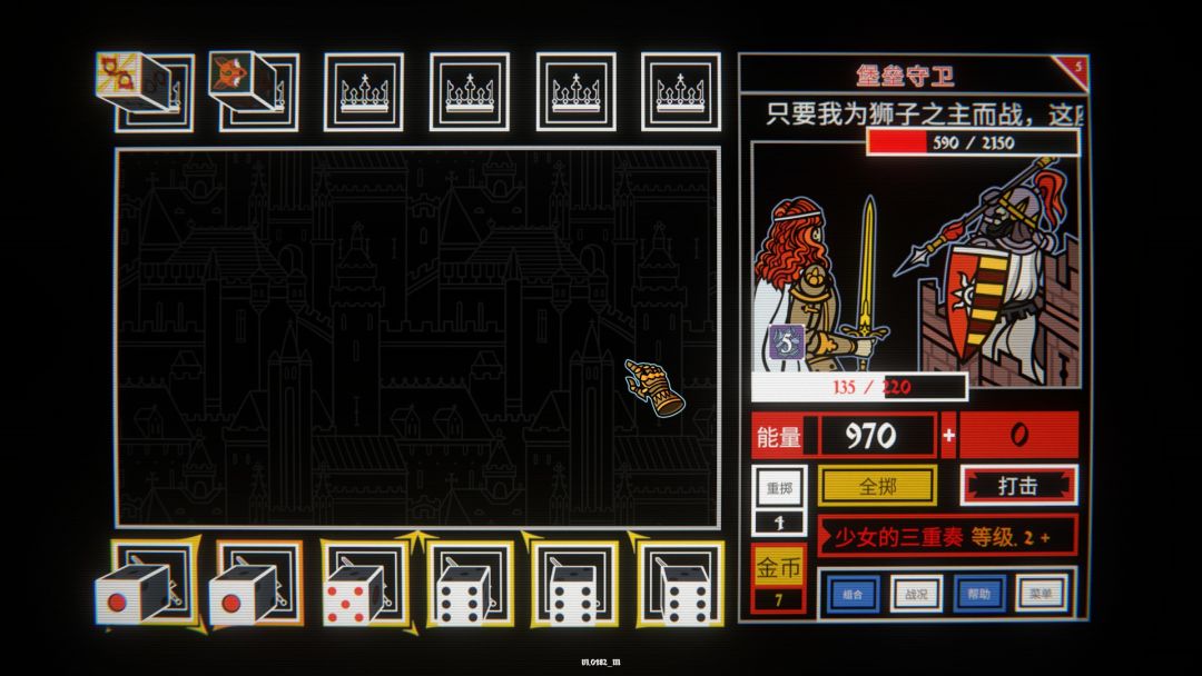 而除了运气,游戏中还加入了任务骰,其实对于任务骰的理解,你可以将其看作持续生效的道具,一样有六面,正面或者负面效果,获得后可以保留在上方的王冠方格中,效果则是从左到右激活,需要注意顺序,持续保留不会在打击后消失,并且保留的任务骰也可以重掷,说到重掷,任务骰如果是不想要的负面效果,可以重掷,重掷会让你选择一枚你想要重新投掷的骰子,而不是将所有未保留的骰子都重新投掷,当然对于基础的骰子点数也可以利用这个来单独重掷点数获得组合。