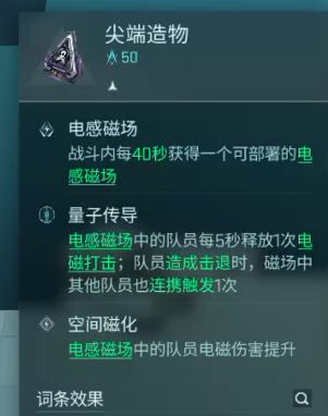 这里还有一点很重要,指挥官是能吃到尖端造物效果的。另外最后一个效果是对电磁伤害有加成,比较推荐电磁伤害角色上场。所以是非常好用强力推荐的一个战术模块。