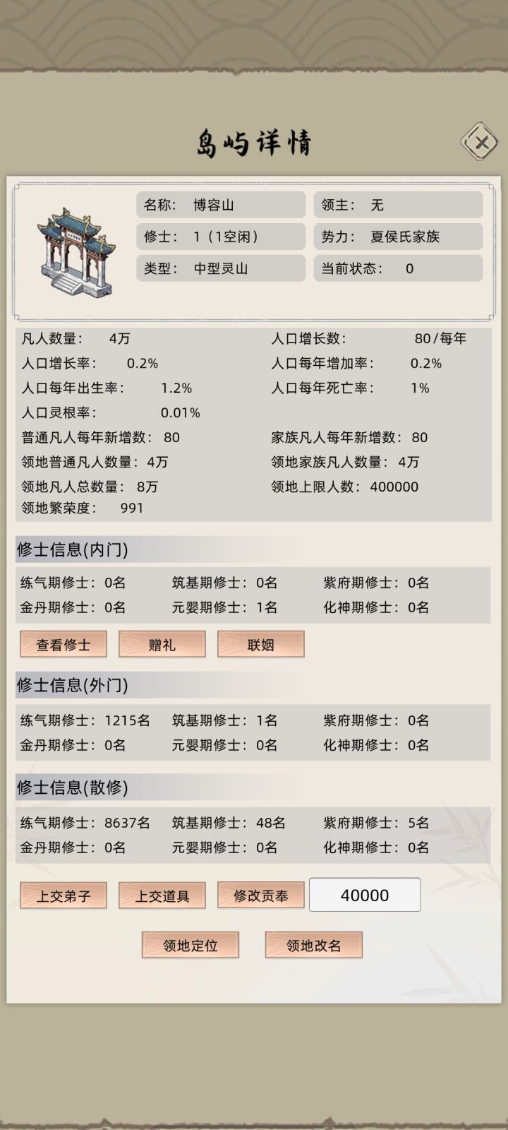 占领一个岛,根据自身实力来定,前期的话小型中型就行,派出一个自身实力一般的弟子,需要什么突破材料就派出什么弟子,且派出之后自身家族等级不变,然后进行分家,比如派出一个元婴之后,分家的等级会达到七级,过大概10年到100年,就可以从分家那里上交突破材料、装备、功法、土壤突破材料等等,无本万利,不想用了把弟子上交了就行。如果是自定义增加的分家弟子会有突破和修炼加成,可以白嫖修炼速度和加成。(要注意的几点:1自身家族等级一定要时刻比分家的要高,2弟子的性格不能是无法上交的,比如枭雄,3分家供奉的话尽量是零,等他先成长一下在割菲菜,因为供奉不足的话会扣好感度,好感度不够的话会上交不了弟子,菲菜长好之后就把弟子上交然后打他,多次掠夺,还可以得到妖血,直至把他榨干为止)