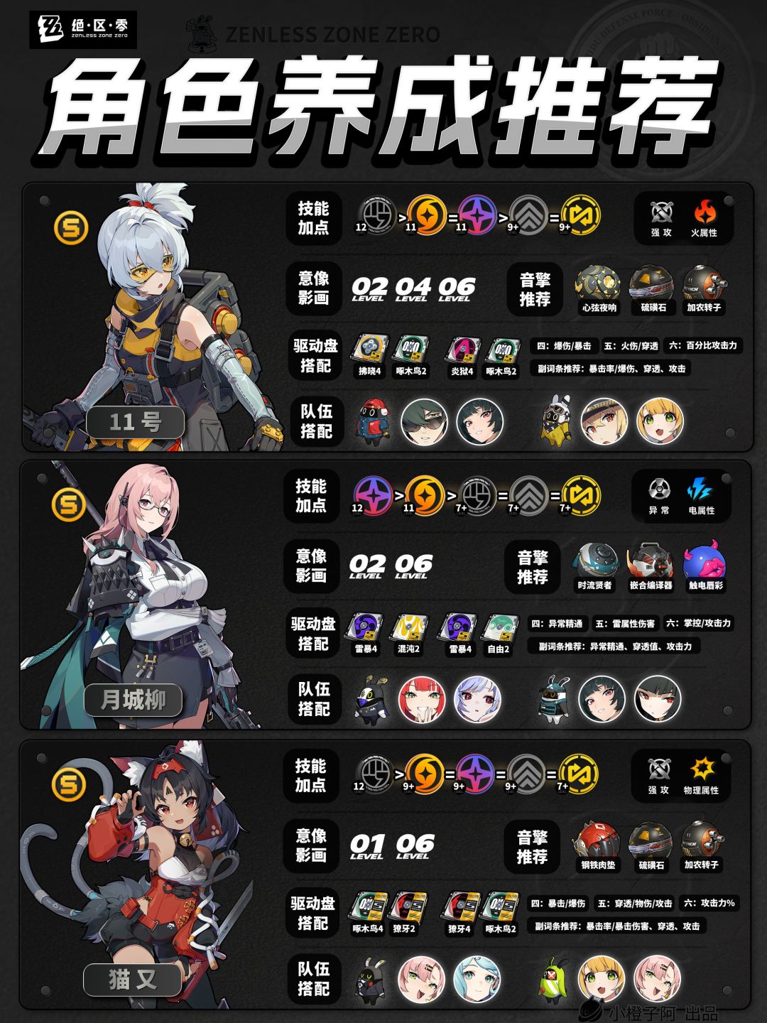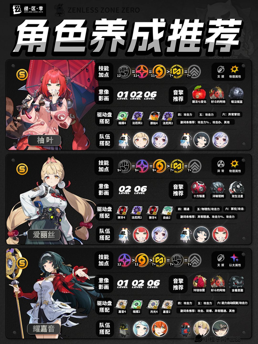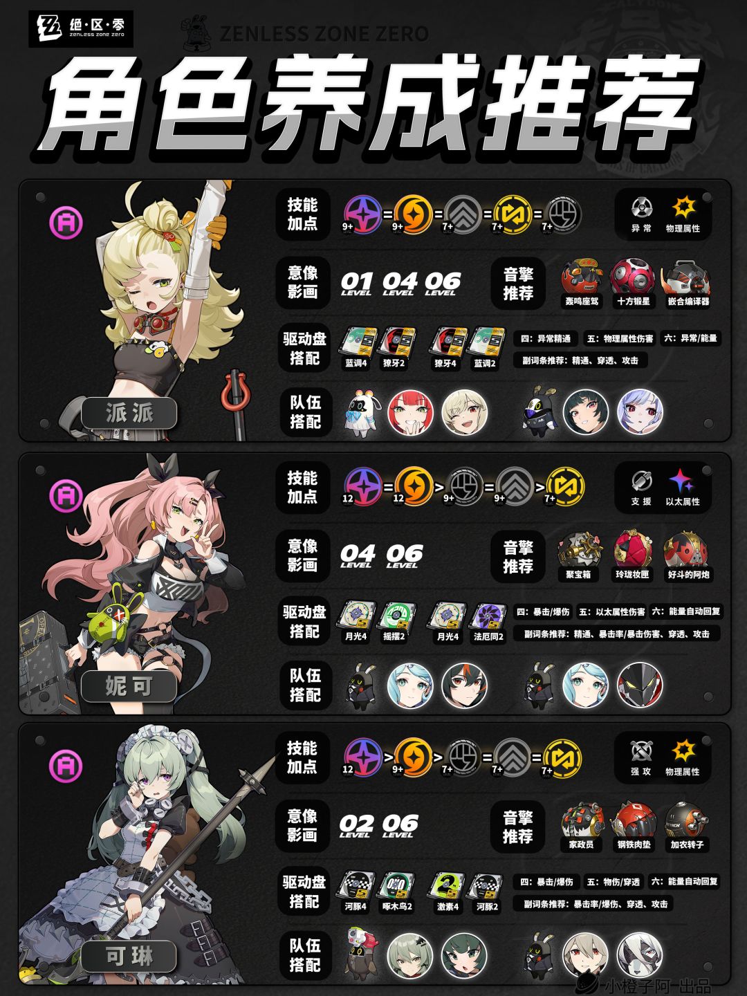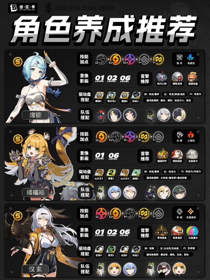 再就是一点,由于图片大小的限制,橙子每次是把角色配队更新到最新角色的组队情况,但并不代表角色只能有这两个配队,比如支援角色【丽娜】,丽娜可以加入绝区零大多数的队伍,而不仅限于下方展现的两种配队情况。