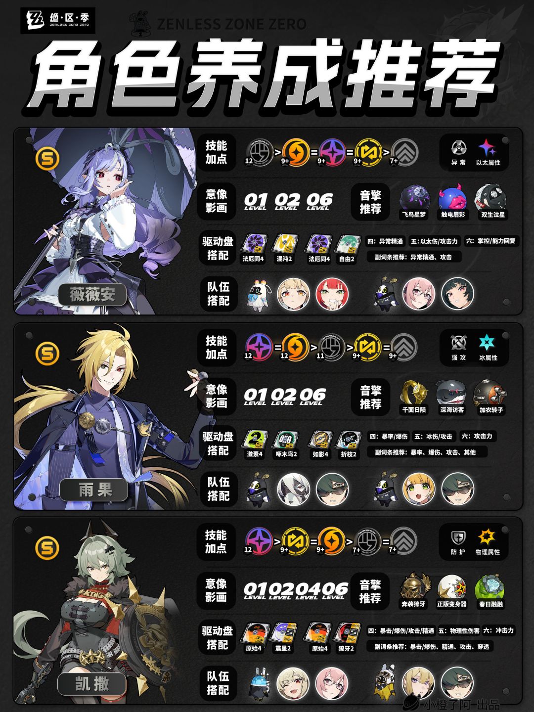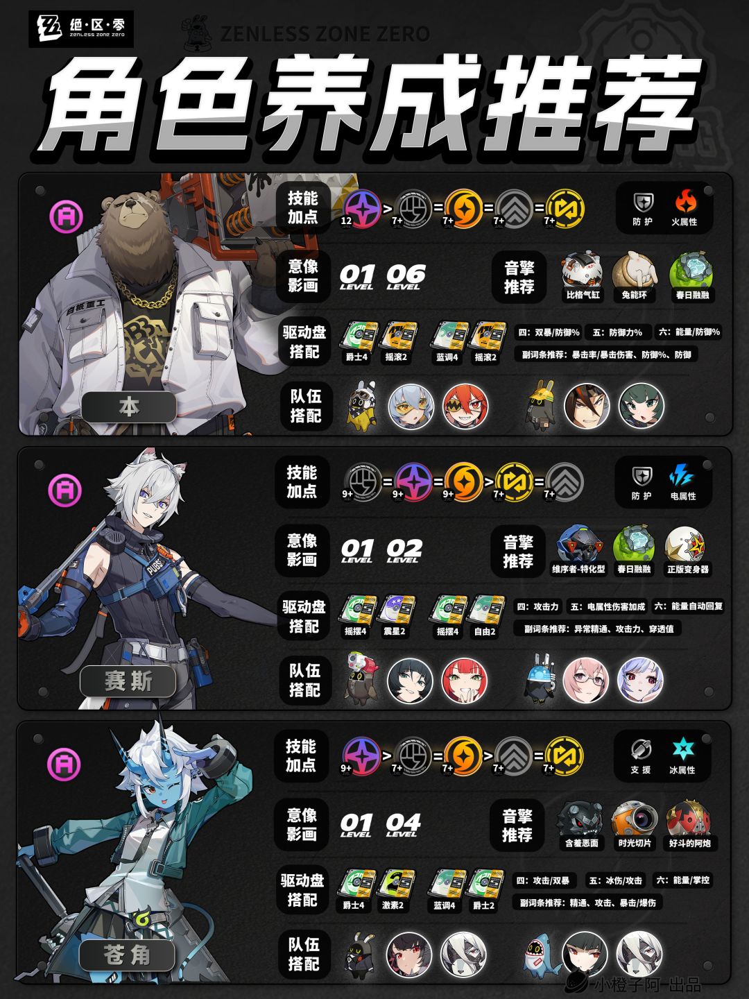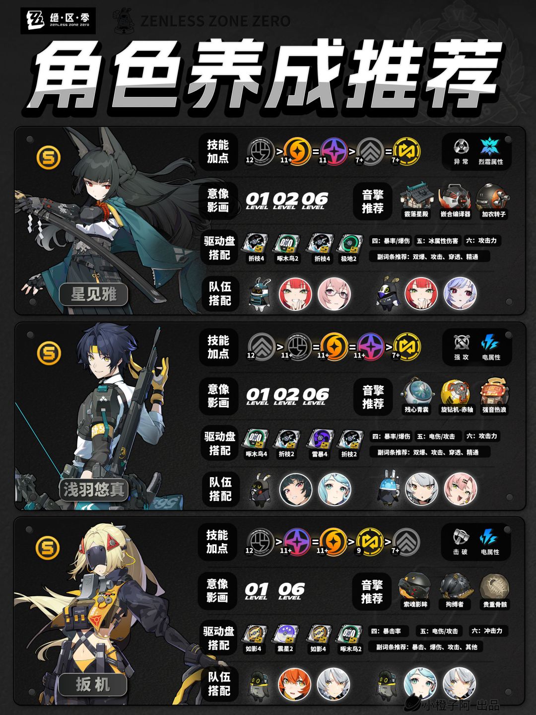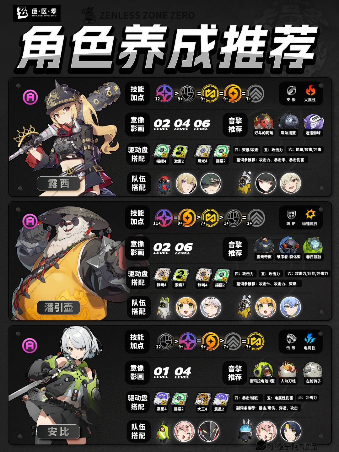 再就是一点,由于图片大小的限制,橙子每次是把角色配队更新到最新角色的组队情况,但并不代表角色只能有这两个配队,比如支援角色【丽娜】,丽娜可以加入绝区零大多数的队伍,而不仅限于下方展现的两种配队情况。