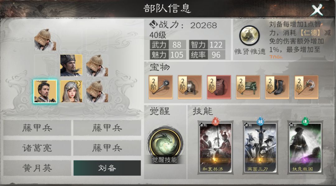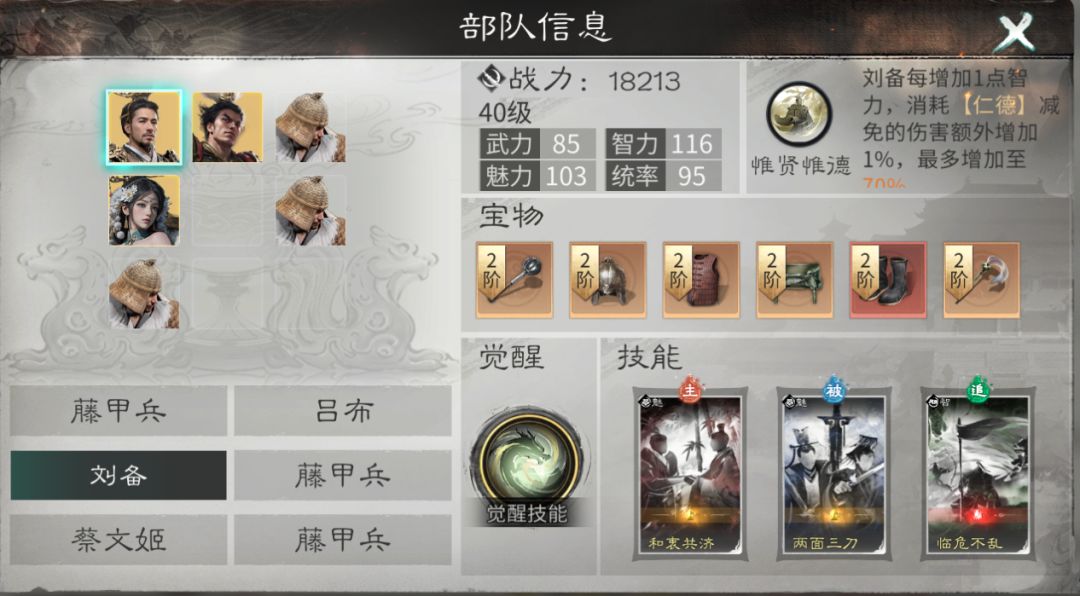 刘备的觉醒技能可以让刘备快速获得大量【仁德】层数,并且为我方兵力最低的单位施加【结义】为其分摊伤害。非常好的弥补了刘备【仁德】层数获取慢的问题,还给刘备提供很强的保人能力。