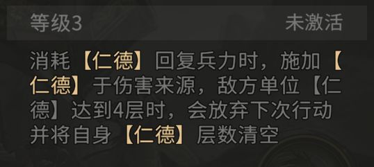 等级3的天赋技能时刘备的质变,可以施加【仁德】给敌方单位,达到4层时可以让敌方放弃下次行动,这个效果非常克制以高频率伤害和AOE伤害为主的英雄。