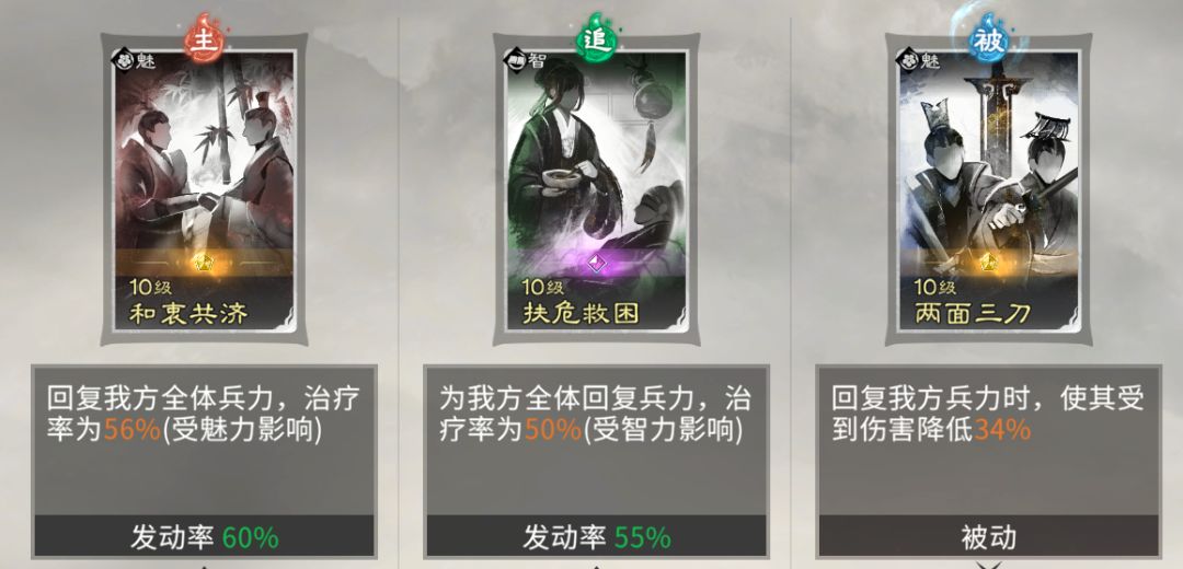 两面三刀:回复我方兵力使,使其受到的伤害降低34%。