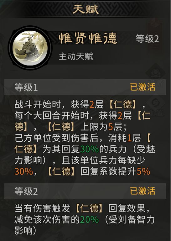 刘备的天赋技能围绕着【仁德】展开,可以在我方单位受到伤害后消耗仁德回复兵力,等级2的天赋技能可以再回复兵力时减免该次伤害的20%。