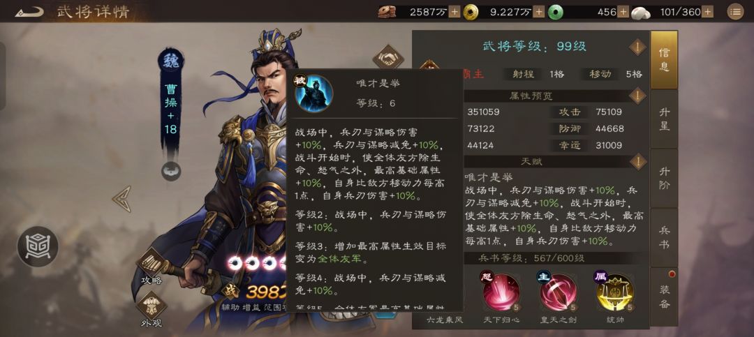 越级沙盘里敌人的主属性都非常高,因此曹操加主能力25%的特技就非常重要!要想打的动敌人,上曹操就对了!